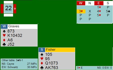 Som om det ikke var nok, så slapp israeleren unna et spill der han pakka kortene i mappa og claima resten av stikkene, uten å vise fram kortene sine. Stakkar 112 år gamle Alan Graves trodde på ungdommen og oppdaga ikke at det mangla et stikk. Det er det helt sikkert siste gangen han gjør fordi det stikket avgjorde kampen! Så vidt jeg vet har ikke Lotan Fisher en gang fått en advarsel for usportslig opptreden.
