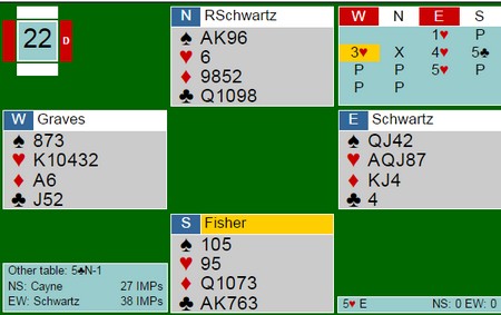 I Nationals i Chicago røyk Espen og Boye ut på et spill der appellutvalget, nok en gang etter min mening, overkompenserte en mulig feil. Dere kjenner sikkert spillet og jeg hadde forstått hvis Alan Graves hadde blitt nekta å melde det han gjorde (5hj). Under appellbehandlingen, der Fisher - Schwartz, opplagt var i ferd med å tape anken, fikk de lov til å bytte argument fra en ulovlig melding til en manglende alert av kravpass. De hevdet å ha to ulike systemer om motparten kravpasset eller ikke. VAS, fordi de kunne bare spurt!