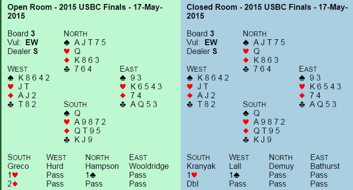 Poenget er øst sin andre melding. Begge vest viser hjerter med 1ru-meldingen. Terje Lie løfter bare til 2hj, mens Jan Tore Berg hopper til 3ru for å vise singelton og hjerterstøtte. Over 2NT (minst invitt) hopper Terje Lie nok en gang forsiktig til 4hj. "Jeg har tillegg, men ikke nok til et cuebid". Odin Svendsen er naturlig nok ikke til å stoppe på det andre bordet.