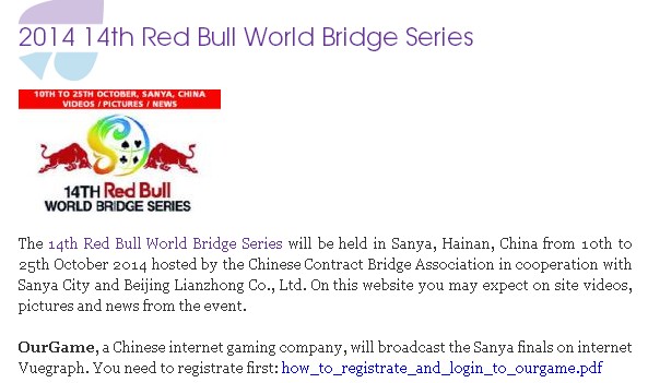 Det blir sendt mye på BBO fra Kina, men kineserne har sitt eget program i tillegg. Hvis norske spillere ikke vises på BBO; kan det hende det sendes på OURGAME. Under finner du link til registrering. HER ER PROGRAMMET FRA BBO