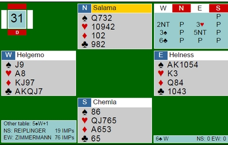Tor og Geir cruiser av gårde og dette spillet viser noe av hva som skiller dem fra mange (de fleste) andre. Hvor mange av dere hadde tenkt på å meldt 5NT, pick a slam, på Tor sine kort? 6kl er overlegent beste kontrakt og har masse vinnervarianter. Jeg tipper 6NT var det mest vanlige prosjektet og sitter tieren fjerde i ruter. må sparkappen gå. Det skal sitte VELDIG surt for at det ikke skal blir tolv stikk med kløver som trumf.