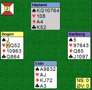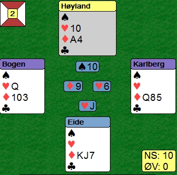 Erik Berg i vest startet med tre ganger ruter til stjeling i øst. En hjerter ble kastet i bordet. Steffen skifta til hjerter ni som Boye vant og fortsatte med to ganger spar til øst sin konge. Nå spilte Steffen hjerter fem og Boye måtte ut å gjette. Ikke unaturlig valgte han å stikke og håpe at kløveresset satt i øst sammen med dobbel hjerter. (Bordet har passet på å ha inntak på sparsekseren) Det gjorde det ikke og en tøff beit. |