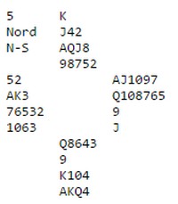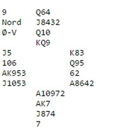 avhengig av ruterdamen. Vest-Adger hadde stoppet i 6sp, er kontrakt som lett ble vunnet. Hordaland Sven Olai Høyland og Magne Eide meldte seg helt opp til 7sp. Ser du alle kortene vinner du lett alle tretten stikkene ved enten å stjele ut ruterdamen eller ta kappen. Magne Eide fant en spillplan som var en tredje variant.