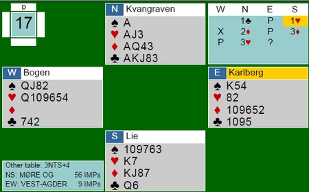 sa Lars Atrhur Johansen til meg i ettermiddag. "Begge bord stoppet ikke før i 7sp". Spillet ser du under og det var to (tre) alternative spilleplaner. Enten kappe/stjel ut ruterdamen eller spille på skvisen i hejrter/ruter. Asbjørn Kindsbekken stjal en ruter sånn at dama falt og tok sine tretter. Tor Eivind Grude gikk for skvisen og beit. 2310 er 20 IMP som svinger motsatt vei hvis ruterdamen er på den andre hånd.