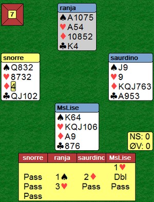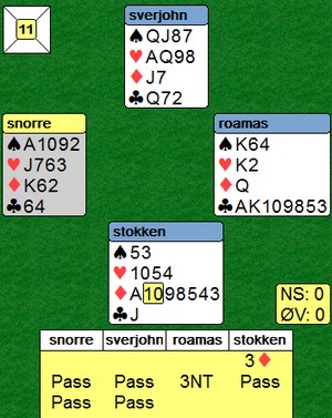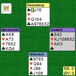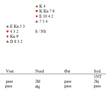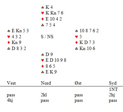 Dette var ikke akkurat noe kunstverk, men en må telle. Jeg spilte ut singel ruter til esset. Så skulle nok spillefører gått på kløveren for å få en stjeling, men det så ubehagelig ut med ruter og ruter. Tre ganger hjerter og en liten spar fra hver hånd. Makker var inne på spar knekt og tok for ruterkongen. |