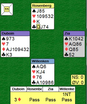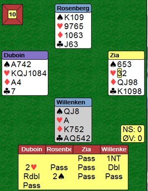Det er en grunn til at vi får utdelt syvkort-farger. Det er at de skal meldes. Duboin fikk første stikket for kløverkongen, spilte hjerter til esset og tok en tapende ruterfinesse. Nå ser det ut som det er beit siden han ikke kan unngå tre spartapere ved å røre fargen selv, men se hva som skjer når det kommer mer kløver til esset og ruter til spillefører. Spar til tieren og syd er innspilt siden ruter 8 er forbindelse til bordet. To gode spill for Zia og Dubion. |