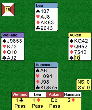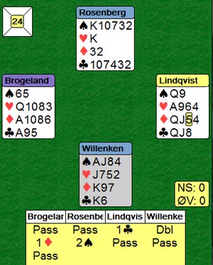 Begge spillerne i kampen tok for kløverdamen og satte seg så til å tenke. Du skjønner hva som skjer nå og kontrakten fyker hjem når du må spille til dobbeltrenons. Her er alle kortene.
