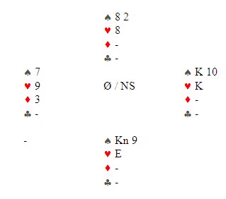 Kløver knekt ga fire stikk i fargen. De tok spillefører og gikk inn i bordet og hentet to ruterstikk. Før den siste ruteren er stillingen: