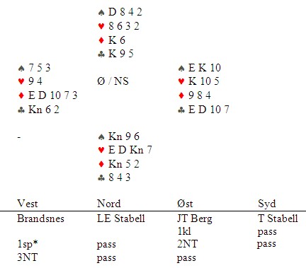 Tolle Stabell spilte ut spar 9, svenske utspill. Dette er typisk fra knekten tredje. Den gikk via damen til esset. Så ruter til tier og konge. Leif Erik Stabell skifta til hjerter 2, svenske som viser fire stykker, som gikk rundt til syd sin knekt. Spillefører var markert med kongen tredje i hjerter, så Tolle fridde seg i ruter som bordet vant med damen. Nå gikk faktisk toget for NS.