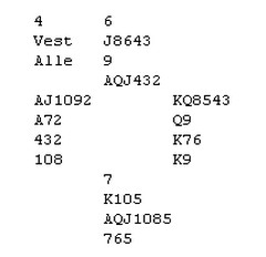 Veldig bra av Peter Marstrander. Han ble presset helt til 3kl, en kontrakt som ser helt død ut med sparesset, tre rutertapere og en hjertertaper. Følg med. Først et apropos til meldingene. Kunstige meldinger er vel og bra, men det gir motparten muligheter til å komme med der et naturlig meldingsforløp holder dem ute. 1kl - 2kl og det går pass rundt. Nå kunne øst doble 1sp (1sp viser IKKE spar) og dermed være med til 2sp. Nok om det. Spar til esset, spar til kongen og spar til stjeling. To ganger kløver inn i bordet og ruter knekt!! Nå må faktisk Steffen i øst legge liten for å beite. Det er ikke mulig vel? Ruterkongen fikk han beholde på og skifta hjerter. Peter slapp den til kongen og nå ser du sikkert hva som skjer når han spiller mer ruter. Vest kommer seg ikke ut av ruteren og må avslutte med hjerter opp i EJ eller et kort til dobbeltrenons. Flott spilt!! |
