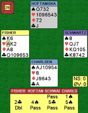 Jeg er ikke helt sikker på hva 2kl fra Hoffa er i andre melderunde. De spiller en Gazelli-variant over 1Major - 1NT og det ser ut som dette er noe av det samme. (2kl viser en god hånd- minst 15 hp) I alle fall ble 2kl alertert ved bordet. 12 stikk og en slemsving inn mot 5kl på det andre bordet. |