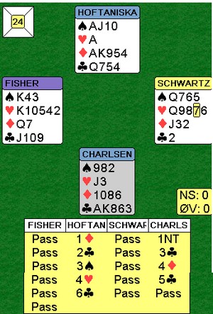 Thor Erik Hoftaniska og Thomas Charlsen spiller for engelske Janet de Botton og var på BBO i tredje runde. Kampen endte 23-23, ikke minst takket være denne tøffe slemmen av nordmennene.