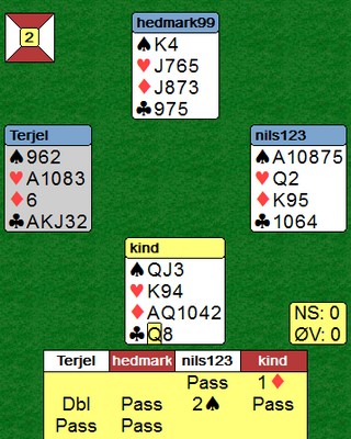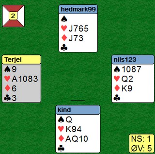 Asbjørn hadde et ekkelt utspill og starta med kløverdamen til esset. Spar fra bordet og Roar Voll gikk opp på kongen for om mulig kunne få spilt ruter gjennom, men Nils stakk og fortsatte i spar til syd. Mer kløver til tieren. Nils fortsatte med kløver og mange ville stjålet i syd. Med det resultatet at han var innspilt. Dette så Asbjørn og lå unna to ganger. Stillingen er nå som under: |