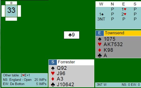 Forrester la en liten og da hadde Arthur rukket det han ønsket med å få det niende stikket sitt. Etter ruterdamen ga han bort et hjerterstikk og vant kontrakten med 1 + 5 + 1 + 2 = 9