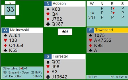 og det var Arthur Malinowski på De Botton som satte Tony Forrester på en prøve. Mot 3NT kom det kløver 9 ut til esset. Så en liten ruter fra bordet. Stikker du opp eller ikke?