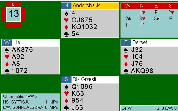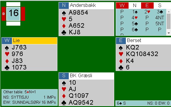 De to første meldingene var likedan på det andre bordet, men der doblet syd for å vise begge minor. Jeg liker Bård Kåre sin 3kl bedre, fordi det er så stor kvalitetsforskjell på EDxxxx og D10xx. Nord fulgte fint opp med 4hj og viste (minst) en god løft til 5kl og kortfarge i hjerter. Hadde nord hatt ruterkongen i tillegg, ville de kommet til 7kl. Nå stoppet de fint i lilleslem og med rutersitsen var det ikke mulig å gå beit.