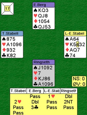 Ser du godt på spillet, finner du ut at det står 3NT ØV. Ruteren er blokkert fordi vest har åtteren og syd Kn10x. Syd må avblokkere hvis makker tar for EK, men da er åtteren blitt størst. Kløveren sitter også på best mulig måte. Ingen av parene kom selvsagt i 3NT, men 3hj kunne ikke vinnes. Enten måtte det bli to rutertapere og en spartaper eller en i spar og to i ruter, i tillegg til to i hjerter. +50 til Stabell og +250 = 6 IMP inn. Stillingen er nå 40-39 til Stabell.