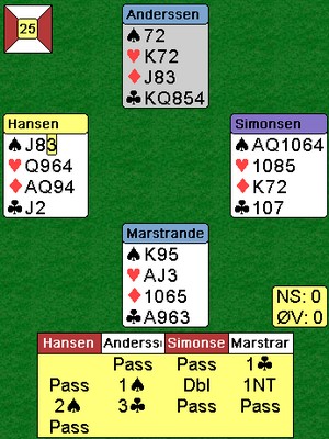Finalens fineste spill synes jeg Johnny Hansen sto for. Han traff utspillet med ruter ess, fordi da var han inne og kunne skifte trumf i stikk to. Det klarte han!!