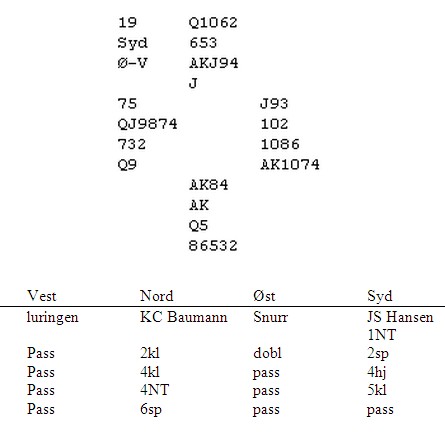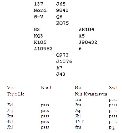 En annen ting er at gode par vegrer seg mot på melde NT når det ser ut som kontrakten spiller best fra makkers hånd. Øst ville ikke melde NT med singel kløver og vest ville i melde NT med to små spar. I teorien er dette selvsagt rett, men i praktisk bridge må en noen ganger melde praktisk. Jeg synes at en av dem rett og slett skulle meldt 3NT på et eller annet tidspunkt i meldingsforløpet. (På den annen side er det bare å flytte vest sin hjerterdame over til ruter, så er 6ru en glimrende kontrakt. Likvel tror jeg ikke paret "visste" at de meldte med tolv mot tolv og ingen voldsomme fordelinger på noen av hendene)