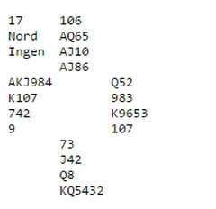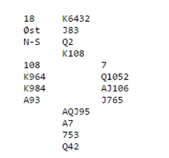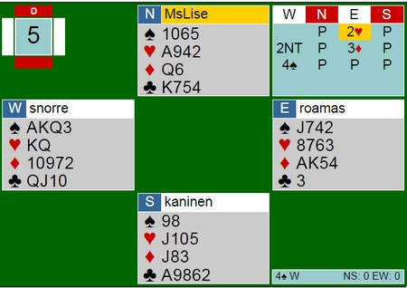 Lise Blågestad fant eneste utspill som ga meg problemer, spar, men det burde gått greit likevel. Jeg stakk på hånda, ruter til esset og kløver mot. Håpet var at kaninen stakk opp med honnør i forhånda slik at jeg kunne presse ut den andre honnøren. Det skjedde ikke og Lise kom inn på kongen for å spille mer trumf. Nå blødde jeg og oppdaga at jeg hadde krøkka til hele spillet i det jeg la ned hjerterkonge med håp om at den som hadde esset ikke hadde den siste trumfen. Jeg fikk kasta ruter, men hadde ødelagt forbindelsene mine. Trykk på spillet for å se fadesen.