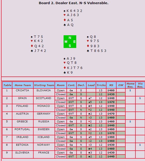 Jeg tar med et spill for å vise at nivået i EM er bra. Denne slemmen ble meldt og vunnet ved samtlige bord i Norge sin pulje. Kontrakten var slettes ikke opplagt, men med spardame og hjerterkongen i kapp var det selvsagt ingen som gikk beit. 6NT er en bedre kontrakt enn 6sp. Hvis f.eks sparen sitter D1087 bak EJ9, vil en oppdage det i tide og dermed kunne redde til corner ved å finne Dxx i ruter.