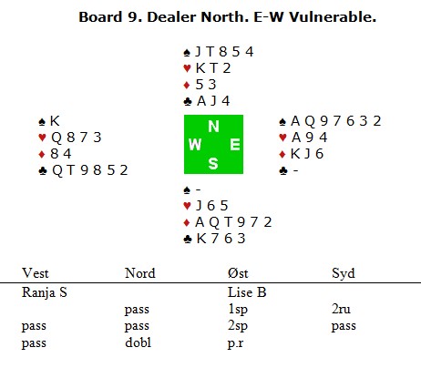 og var i 2sp doblet (!). Dette må da stå, tenkte hun, og var enda sikrere når makker hadde sparkongen!