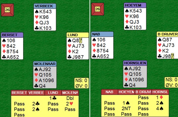 Jeg har ved flere anledninger nevnt at Børre og Ole har en praktisk tilnærming til bridge. De har selvsagt et godt naturlig system, men sammenlignet med nederlenderne spiller de minimalt med konvensjoner. Makkers dobling over 2ru viser tre spar og da flæsker Børre til. Hjerterkongen er et flott kort, det samme med renonsen i ruter og kløveresset. Det er helt umulig å finne ut om makker har kort som gjør at det står ti, elleve, tolv eller tretten stikk. Derfor 6sp og +980. Nederland sin øst viser kortfargen sin i ruter omtrent i samme posisjon, men passer ned 4sp fra makker.