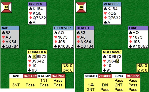 Igjen stemmer teorien med praksis. Når en har knekten femte vs. tieren femte, trenger en mindre hjelp av makker i den første farge for å beite 3NT. Aksel spiller ut spar, sannsynligvis fordi han har en lav sekvens der, mens nederlenderen begynner i hjerter.