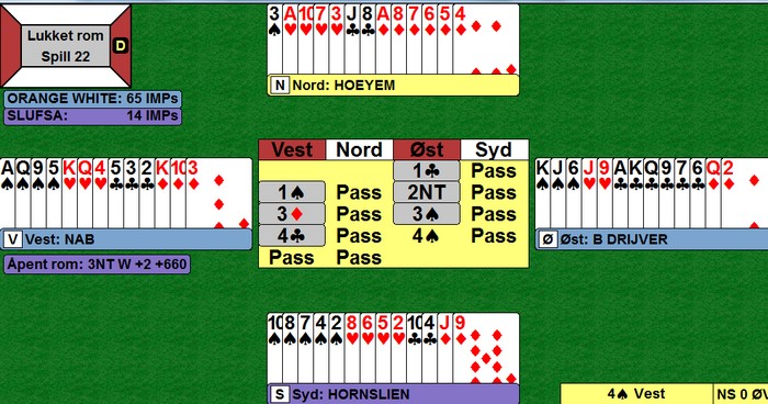 Utspillet var det samme ved det andre bordet og her brukte nederlenderen knekten. Nå var det en fullstendig hjerneblødning hos Nederlenderen som jeg tror hadde tre sjanser til å beite 4sp. Da har ikke klarte noen av dem, hadde makkeren vært rasende og klaska kortene i bordet!