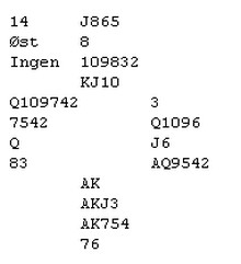 Dette spillet er fra innledende runder i NM lag. Den nye IMP-skalaen er slik at overstikk har fått en betydning også i lag. Seier med 1 IMP er innbyrdes 1 Vinnerpoeng i kamper med få spill, sånn at hvis en er rimelig sikker på overstikk kan en sette kontrakten i fare!!
