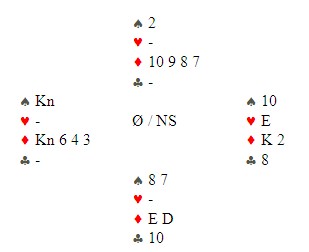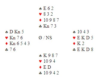 Helge tok for hjerteresset og Åse i syd sliter. Hun kan ikke kaste kløveren sin og hun kan ikke kaste ruter. Derfor måtte det bli en spar. Bordet kaster spar knekt. Helge Mæsel leste sitsen helt korrekt når han så tok for spar ti for å strippe syd, før han lot henne komme inn på kløver 10. Ruter konge tok det niende og siste stikket. Jeg håper spillet blir nominert i klassen for beste spill under Festivalen 2014. |