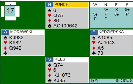 Hjerter ut til esset, ruter knekt til esset og spar dame. Nord kunne holdt spillefører nede på 12 stikk ved ikke å dekke (burde absolutt klart det), men sparkapp og kløverkapp ga alle stikkene. +1310 i dette og +980 i forrige la ikke igjen mange MP til nord syd.