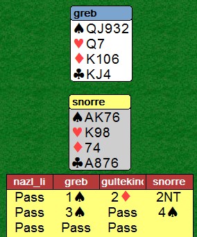 Kristoffer Hegge er en av de som sender inn svar til meg på slike oppgaver. Han har nesten alltid rett, selv om denne kanskje ikke var supervanskelig. Jeg gjentar det snåsværingen sier. Det kommer trumf ut som du stikker i nord og spiller hjerter til kongen. Øst som har meldt inn har 99% sikkert begge de røde essene. Når hjerterkongen beholder stikket, tar du ut trumfen. Aktuelt har øst tre stykker Så frir du deg med hjerterdamen. Har øst Ex, er han innspilt og må enten spille kløver eller gi deg for ruterkongen. La oss si at øst har en hjerter til som han frir seg med. Den trumfer du, spiller kløver til esset og kløver til knekten. Kan øst stikke den, har han fordelingen 3-3-5-2 og bare ruter igjen. Lett? Skulle øst hatt færre trumf, spiller du likedan. Det er best odds for at enten går kløverkappen ellers har øst Dx. Det kan være en variant å spille tre ganger kløver fra toppen hvis øst har en eller to spar (spille på at han har Dxx i kløver), men det er ikke matematisk korrekt. |