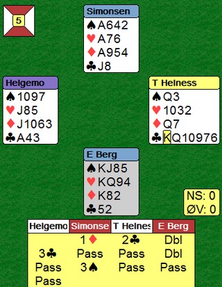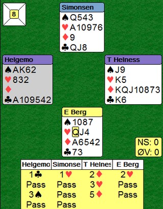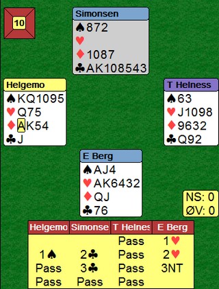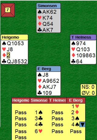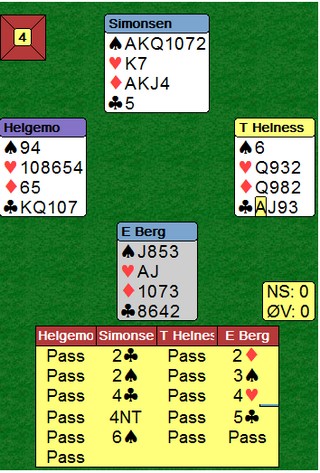 Det var da voldsomt til kort. Steffen fikk ikke satt hjerteren som trumf i tide og måtte derfor ut å gjette. EDxxx og EKKnx i rødt ville vært nok til storeslem, men hvordan kunne han få skjekket hjerterdamen? Etter 3sp gikk det evigheter før neste melding kom og jeg skjønner godt at Steffen sleit. Han tok til fornuften og hoppa ut i 4hj etter å ha prøvd 4kl.