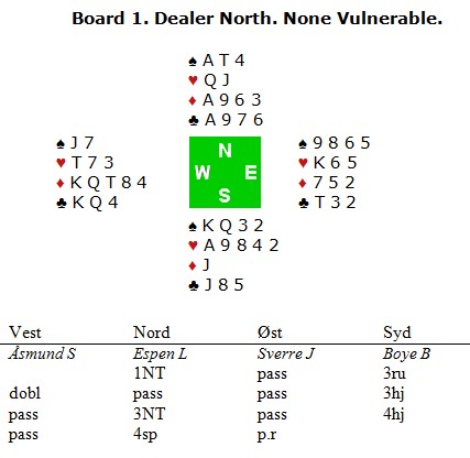 Jeg er aldri noen tilhenger av å melde NT uten hold i motpartens farge, men alternativene var verre for Sverre Johnsen. Spar ut til damen, hjerter til knekten og mer spar til esset. Nå bomma øst ruter med en liten til damen og en ny til nieren. Fire spar stikk, fire hjerterstikk og EKn i ruter ga fire sonebeiter. På den andre hånda kommer sparkongen ut og da er en MYE lengre. Treffer en minorfargene, kan det vinnes åtte stikk.