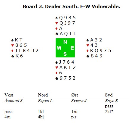 Denne gangen hadde det funka like bra å bare melde hjerter i syd. La oss nå si at makker i nord ikke hadde hatt hjertespillpass, men firekort spar og en god hånd. Hva skal han da melde over 4ru? Derfor spiller de 2kl som 6-10 hp og begge major (4-4 tror jeg). Noe for andre å snappe opp. Når de har kløvertilpass, melder de 1sp.