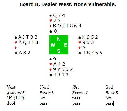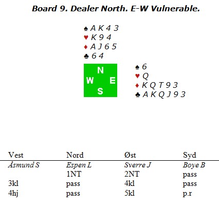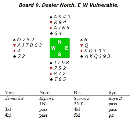 Noen ganger sperrer du motparten bort fra en slem som går beit. Det skjedde i dette spillet. ØV hadde ikke noe annet valg enn å doble 5ru, mens på det andre bordet fikk de melde mer i fred og kom til 6sp.