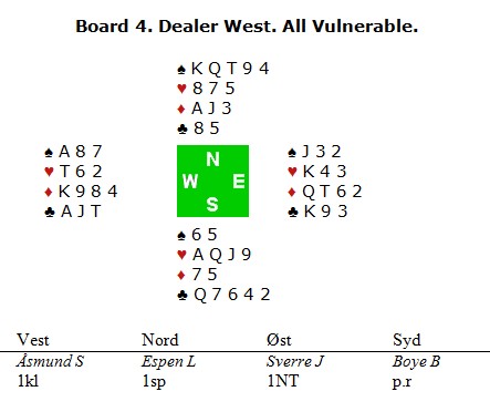 Spar esset og skift til kløver. Hjerter til esset og ruter. Du må stikke med esset og spille mer trumf. Jeg vet ikke om det er rett hver dag hele året, men i alle fall denne gangen når Åsmund Stokkeland kappa på nieren og stjal en ruter hjem. Alt NS fikk var ruter ess og sparesset. Et stor tapsspill siden Mahaffey var i 3kl på det andre bordet.