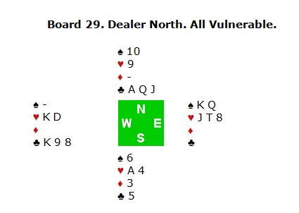 Så kommer den siste trumfen og vest må kaste seg ned til singel hjerterkonge. Bordet kaster et svart kort. Øst har enda ikke noen problemer og kaster f.eks en spar. Nå kløver til kapp og kløver ess. Øst kan gi opp en hjerter på den første, men så er det slutt. Enten vinner E4 i hjerter de to siste ellers blir spar 6 er vinner.