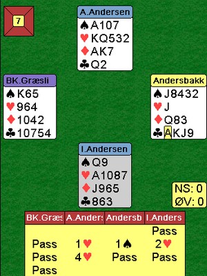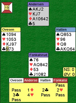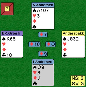 Her spilte Alf Andersen fint mot lederne av Rondacupen - Lag. Det kom kløver ess ut og skift til trumf. Den stakk han i bordet (syd) og spilte mer kløver til dame og konge. Kløver knekten ble trumfet og trumfen tatt ut i to runder. EK i ruter og ruter mot knekten i posisjonen til høyre. Øst måtte stikke og hadde bare spar igjen. Det som var litt trist for nord, var at han hadde hørt øst melde inn 1sp i sonen. Derfor mente han det var mest sannsynlig at han hadde kongen og gikk derfor i med bordets dame. Ei beit, til tross for alt strevet.