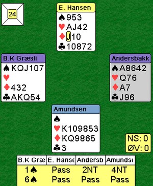 Noen ganger har motparten tatt fra deg så mye plass at du ikke kan finne ut hvor høyt du skal. Da liker jeg aksjoner som Bård Kåre Græsli sitt hopp til 6sp. Han trenger essene i ruter og spar for at det skal stå storeslem, men det kan han ikke finne ut etter 4NT (to farger) fra syd. Da tar han tyren ved hornene og melder det han tror står. Hvis han f.eks prøver å cuebidde på 5-trinnet, risikerer han å ikke bli noe klokere, men motparten finner stampen til for -300 i 7hj. Kontrakten kan også stå på at motparten ikke finner riktig utspill. Med 6sp har vest i alle fall ikke hjulpet til med å sladre. |