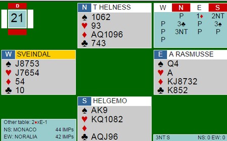 Det kom spar 3 ut, norske utspill til esset. Så hjerter konge til esset og mer spar som Geir la liten på. Vest stakk over med spar knekt og godspilte fargen sin. Geir la ned hjerterdamen og så sitsen. Nå kunne han ikke godspille hjerterstikk fordi da kom vest inn og beita kontrakten. Derfor måtte han gå over på kløveren, men øst passet på å ikke bli hengende i fargen for å spille ruter. Geir fikk altså to sparstikk, ett hjerterstikk og fire kløverstikk, pluss det åttende i hjerter fordi vest rakk ikke å kaste all hjerteren og ruteren sin
