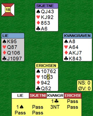 På det andre bordet kom det spar ut fra syd og da rakk spillefører å sette opp sine ni stikk (2+1+4+2 = 9)