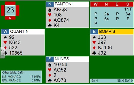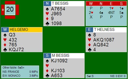 Tor Helness i øst var tilsynelatende superflink ta han la liten på ruter 9. Bessis gikk opp på kongen og smilte en stund da har trodde han hadde lurt Tor. Teller du tapere på hånda, så har du tre i kløver og tre i ruter, men bare tre trumfer igjen. Da ble det ei beit likevel.