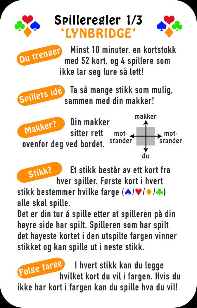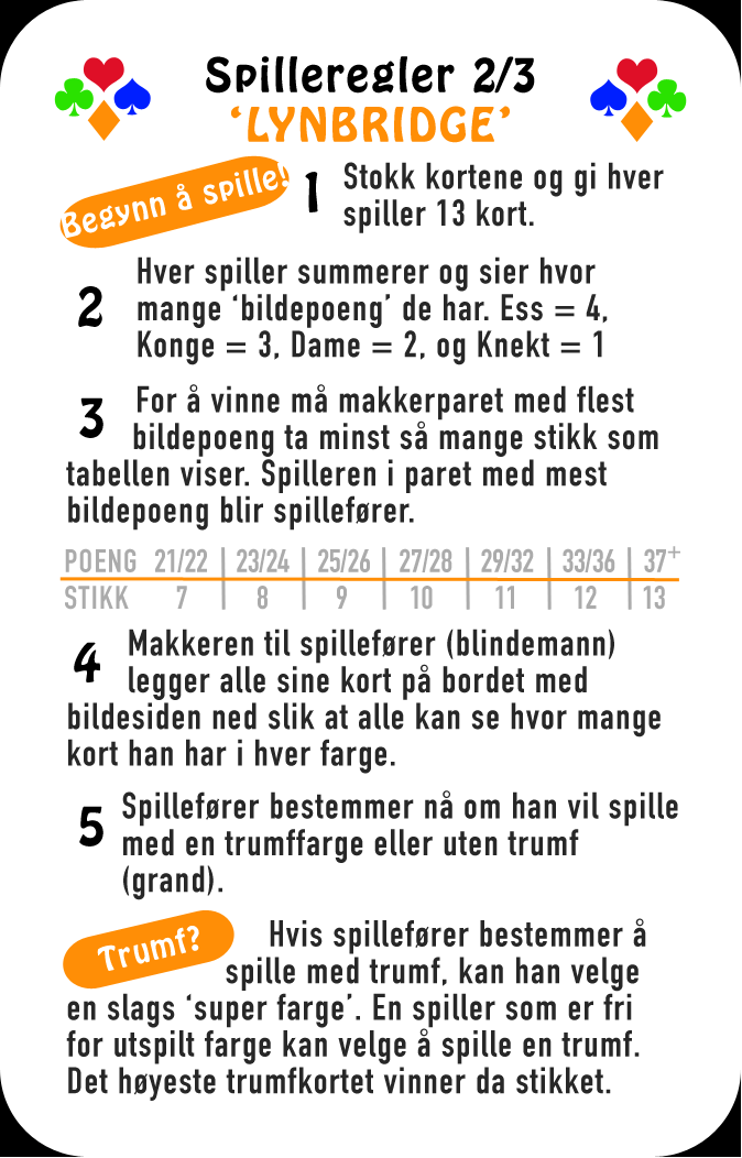 Bridge på 1-2-3 Lynbridge fokuserer på spillet, så meldedelen er svært forenklet. Etter at det forenklete meldingsforløpet er over, er spillet helt likt vanlig bridge. Eksempel på anvendelse av kurset