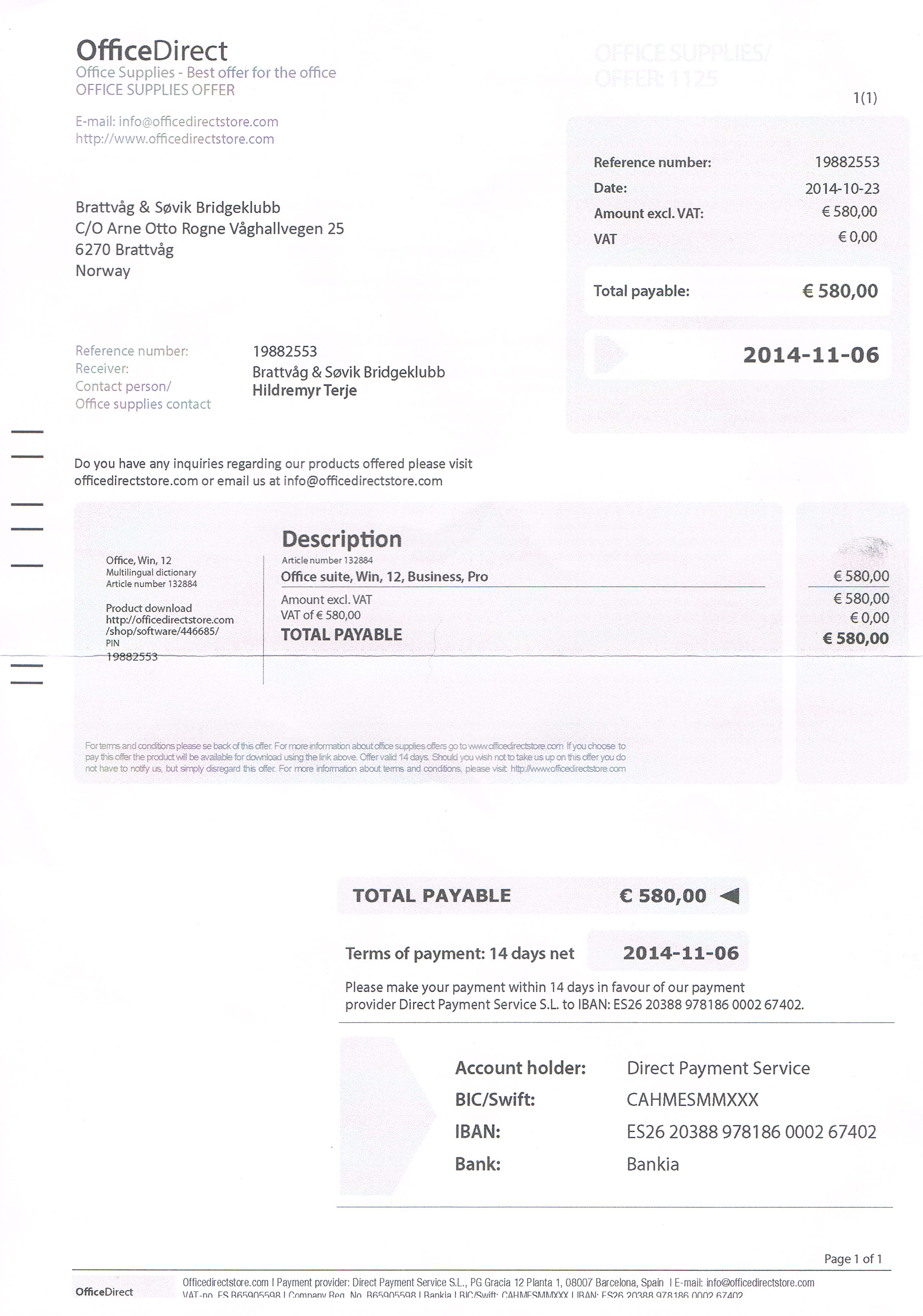 Flere kretser og klubber har i disse dager mottatt en regning fra noe som heter OfficeDirect. Dette er et forsøk på svindel og ikke noe som skal betales!