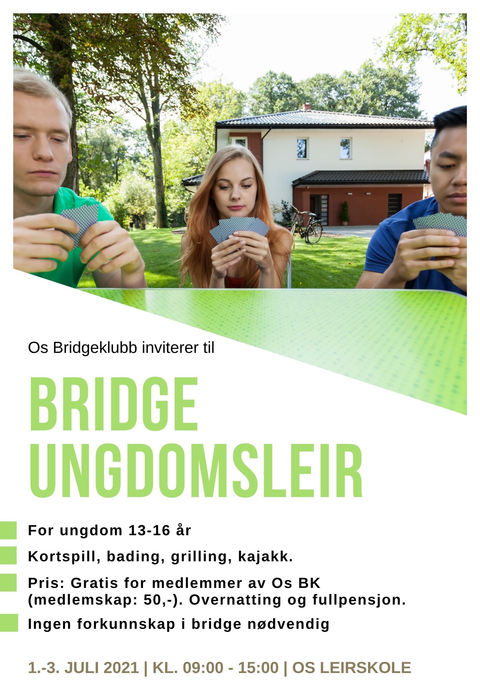Korona vil også i sommer legge begrensning på hvor mange som kan være samlet. Å samle barn/ungdom fra flere ulike regioner vil utgjøre en risiko. Nasjonal sommerleir med bridge er derfor avlyst.