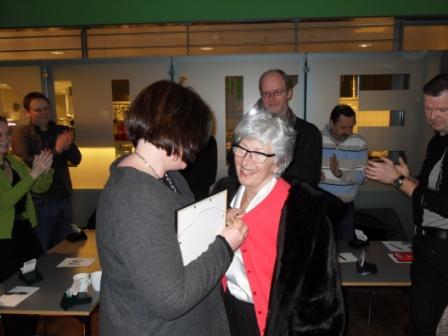 Hedersbevisningen ble overrakt av Kristine Breivik på vegne av Styret i NBF og kretsleder Oddmund Midtbø gratulerte på vegne av NBF Hordaland. Det var en beveget Kirsten som mottok velfortjent hyllest og stående applaus fra de over 260 tilstede i salen. Her kan du lese hva Styret sier i sitt tildelingsbrev til Kirsten Rita Arnesen.