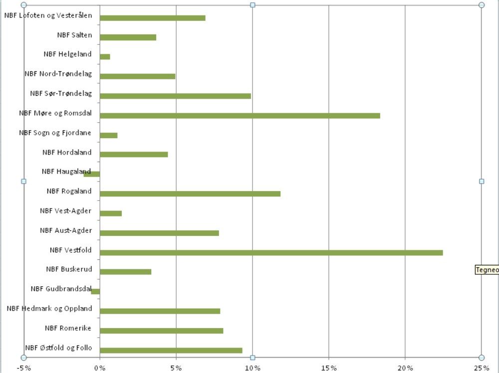 NBF Vestfold, NBF Rogaland, NBF Møre og Romsdal og NBF Sør-Trøndelag har alle økt med over 10 % i perioden.