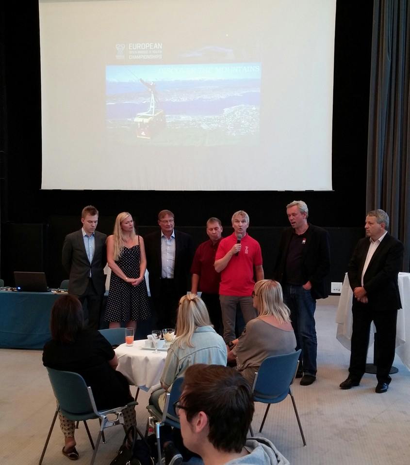 Generalsekretær Knut Brinchmann presenterte EM i Tromsø for verdenseliten i bridge før auksjonen i Cavendish.